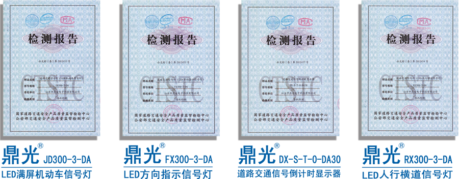 鼎光 交通信號燈符合《GB14887-2011道路交通信號燈》標準,并且通過公安部交通安全產(chǎn)品質(zhì)量監(jiān)督檢 測中心檢測(最新檢測公交檢【委】第2012453-57號),生產(chǎn)、服務(wù)通過ISO9001國際質(zhì)量體系認證。