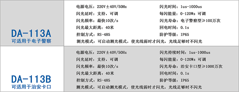 鼎光 DA-113系列數(shù)字閃光燈通過RS-485接口實現(xiàn)閃光燈的數(shù)字化控制,設(shè)定實際所需要的閃光參數(shù):閃光時 間1us-1000us內(nèi)任意可調(diào);支持閃光觸發(fā)延時,延時的時間可調(diào);可啟動測光模式,在光線弱時自動啟動閃光功 能或自動調(diào)節(jié)曝光參數(shù),保證不同光照下最佳的拍照效果;支持現(xiàn)場和遠程設(shè)置參數(shù),閃光燈的特點是功能齊全, 可適用于各種智能交通抓拍系統(tǒng)的需要。是目前市場上電子警察、治安卡口升級改造的首選閃光燈。鼎光 DA-113 系列數(shù)字閃光燈分為兩個版本,具體參數(shù)如下: